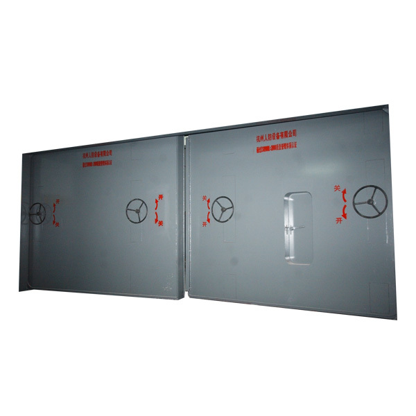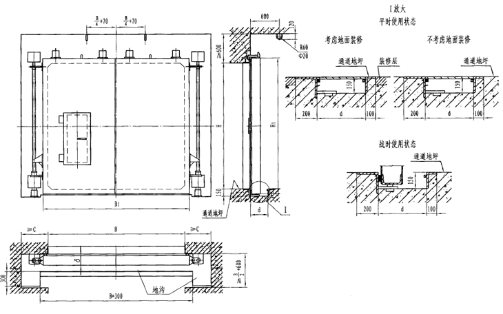 此類門的特點是平時地面無門檻,便于人員和車輛通行;戰(zhàn)時將門扇立轉(zhuǎn)、降落及平移,以滿足防護、密閉要求,其上帶有方便人員臨時出入的小門,平戰(zhàn)轉(zhuǎn)換快捷。新型降落門改進了其升降機構,操作更為方便。