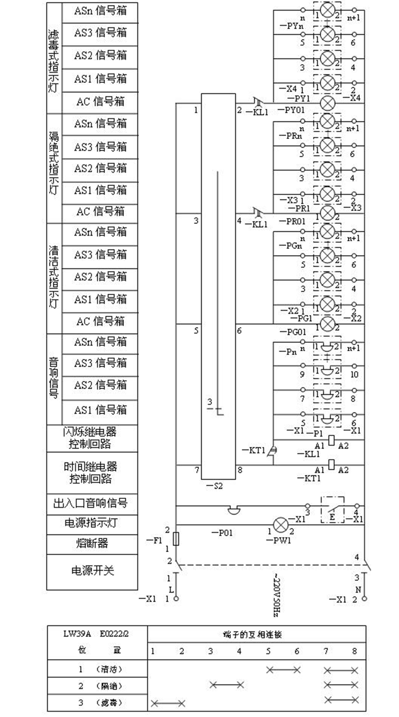 2、AS1~ASn:通風方式信號指示燈箱,分別高在戰(zhàn)時進風房、排風機房、柴油發(fā)電機房、電站控制室、人員出入口(連通口)最里一道密閉門內(nèi)側(cè)及其他需要設(shè)置的地方。數(shù)量由單項工程設(shè)計決定。
