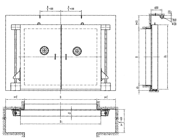 | 型號(hào) | 門孔寬B | 門孔高H | 門扇厚δ | B1 | H1 | C | D1 | D2 |